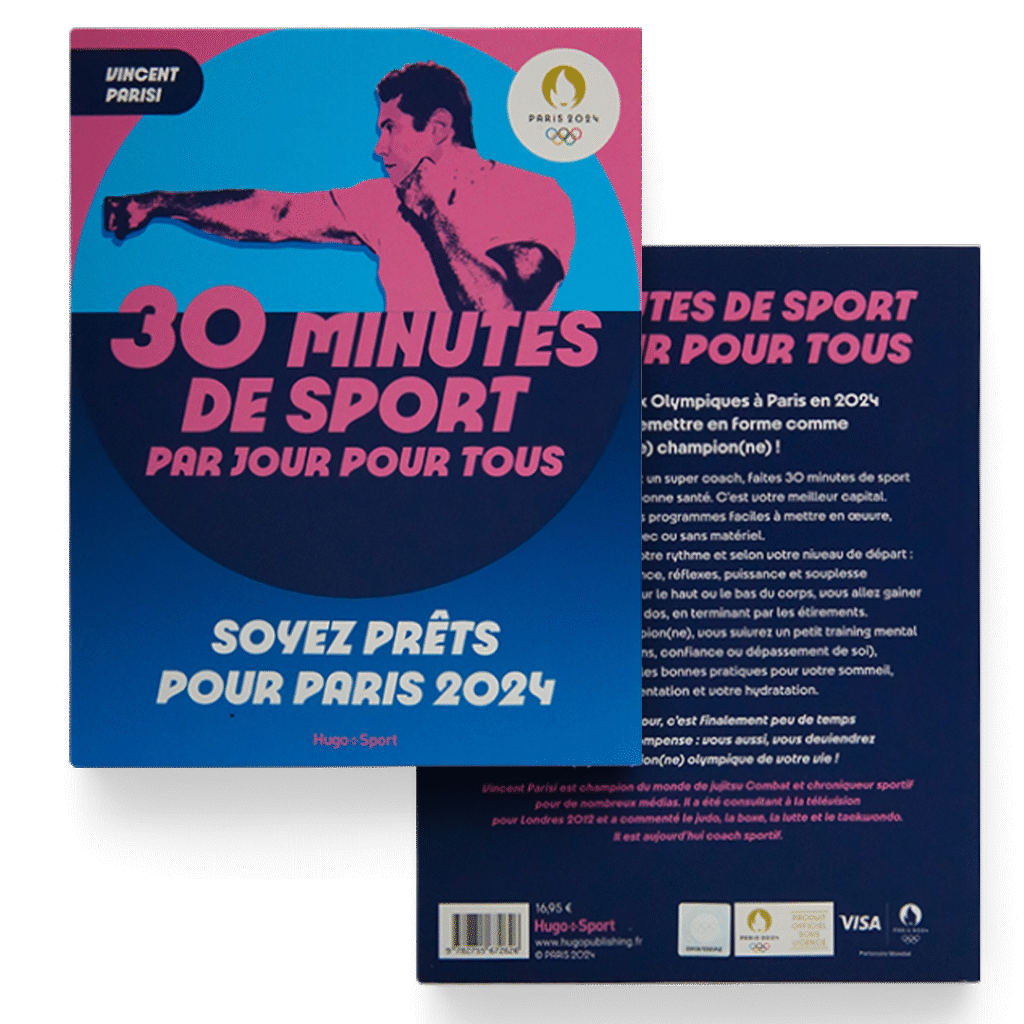 Avec un peu de volonté et un super coach, faites 30 minutes de sport par jour pour être en bonne santé. C’est votre meilleur capital. Vincent Parisi a bâti des programmes faciles a mettre en œuvre avec ou sans matériel. Vous allez développer à votre rythme et selon votre niveau de départ : endurance résistance réflexes puissance et souplesse avec des exercices cibles sur le haut ou le bas au corps. vous allez gainer vos abdos et votre dos, en terminant par les étirements. Et tout comme un(e) champion(ne), vous suivrez un petit training mental (gestion des émotions. confiance ou dépassement de soi), et nous saurez trover les bonnes pratiques pour notre sommeil votre alimentation et votre hydratation.