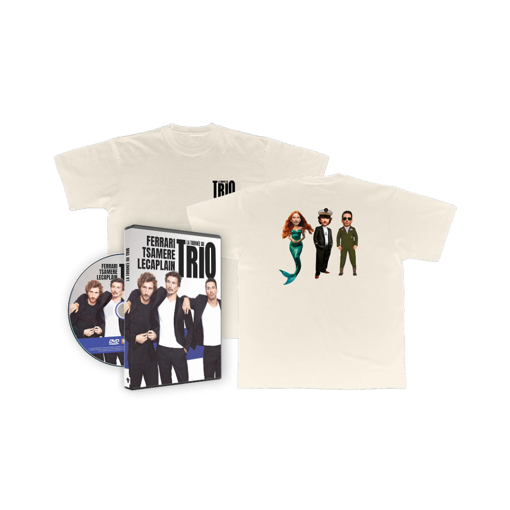 Découvrez le pack de la Tournée du Trio ! Il réunit le DVD du spectacle, pour revivre les meilleurs moments du show, ainsi que le t-shirt exclusif de la tournée.